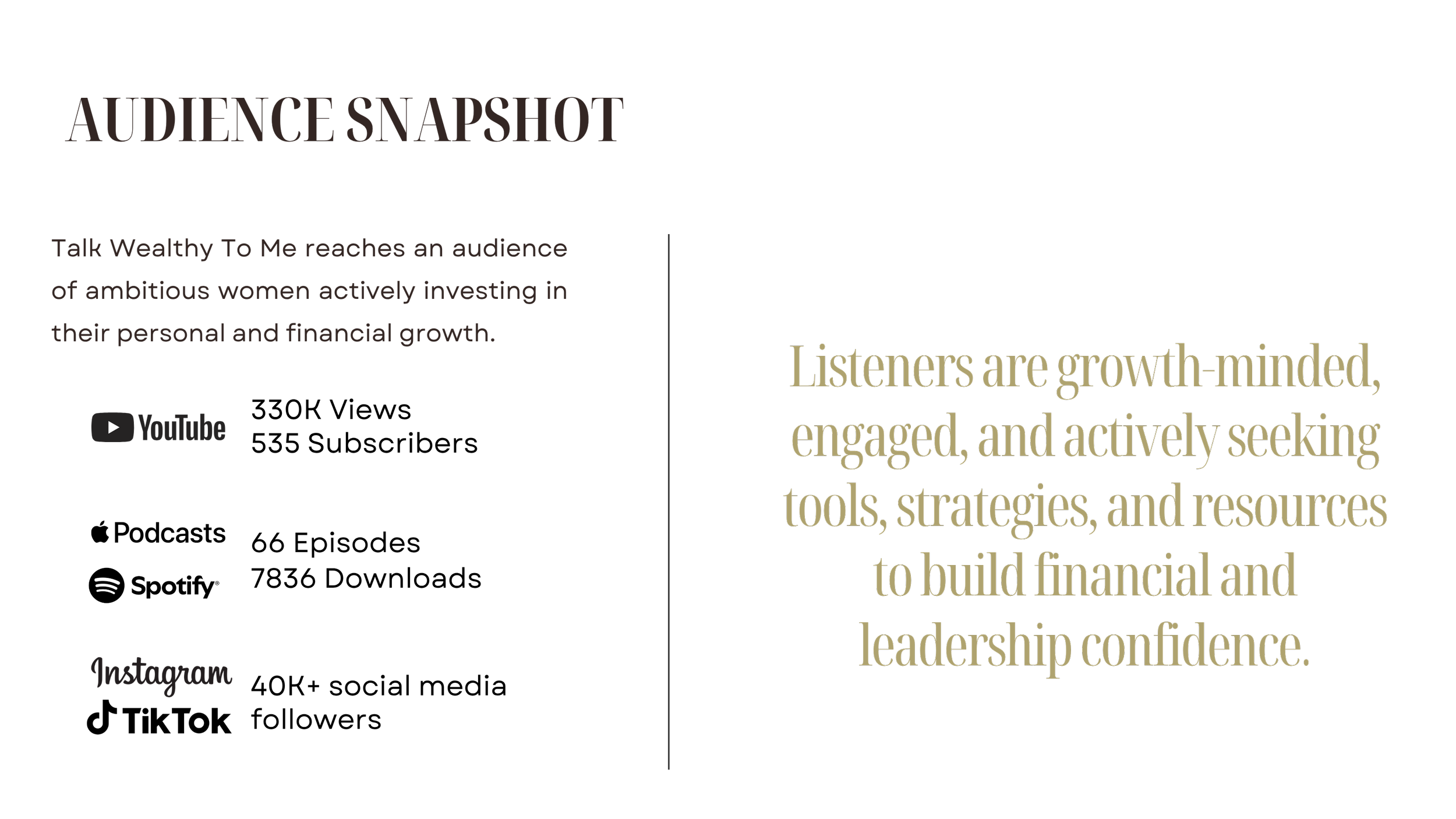 Brands can connect with the Talk Wealthy To Me audience through authentic host-read endorsements, targeted ad placements, and cross-platform visibility.